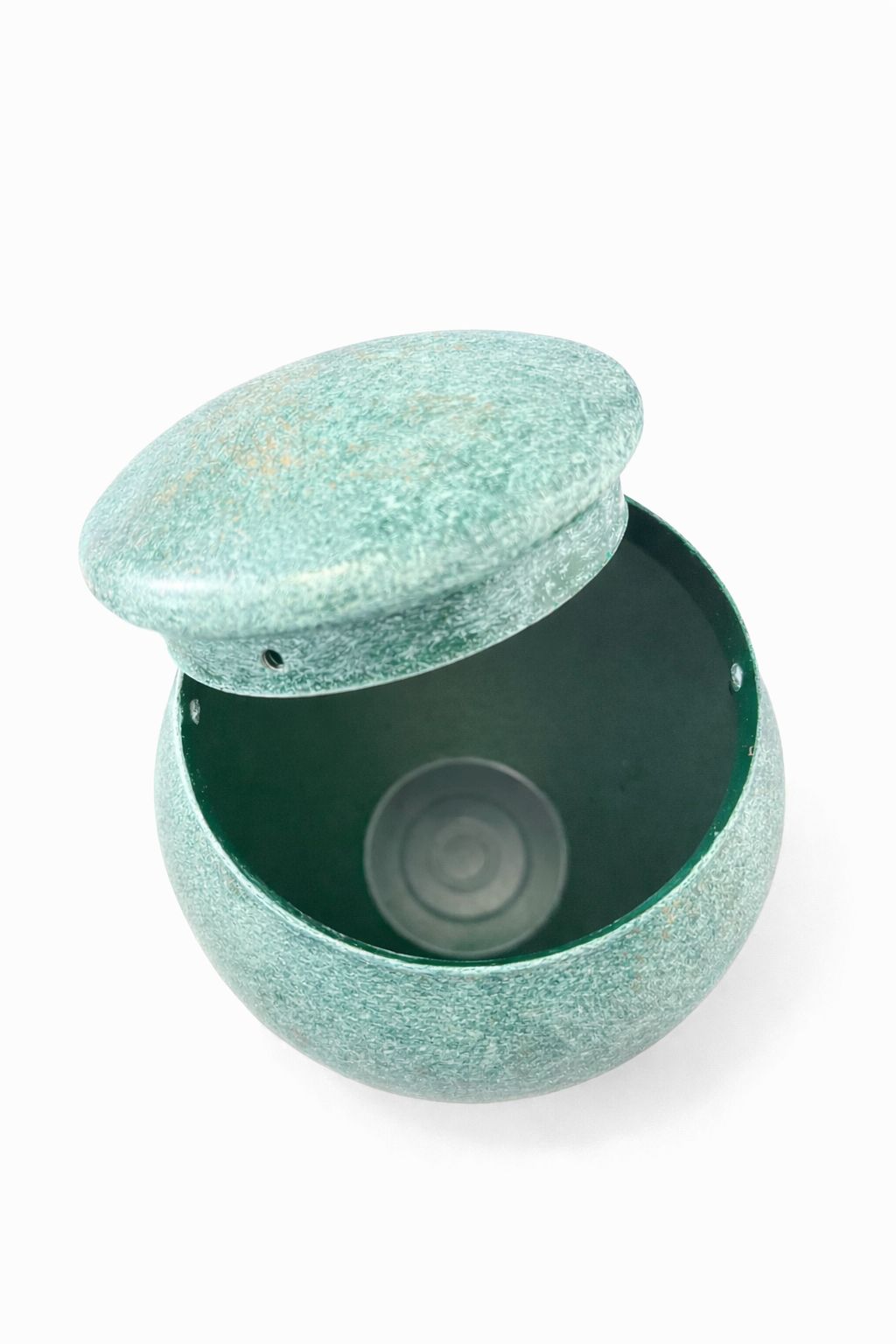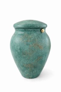 Urna cineraria in metallo dal design classico, con elegante finitura verde effetto patinato.