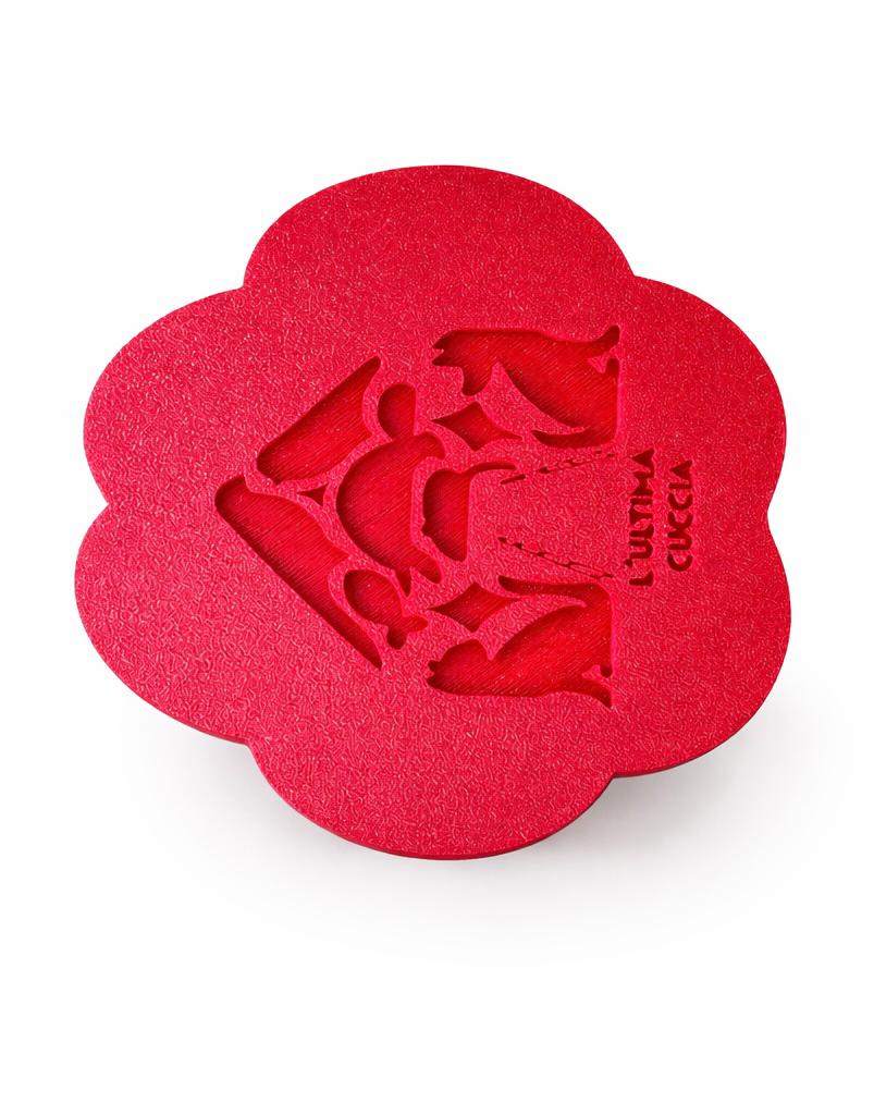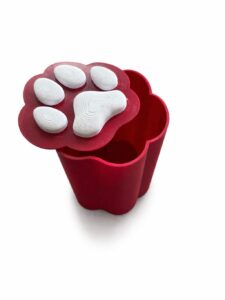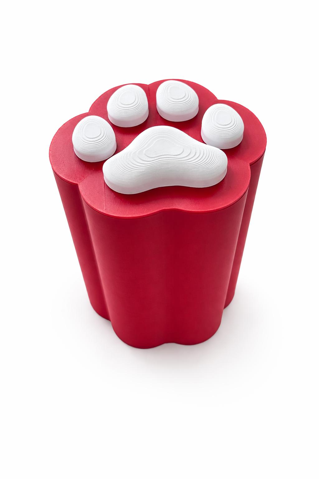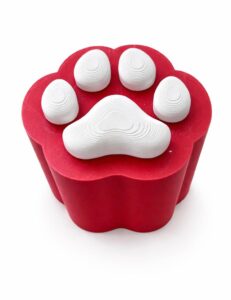 Urna cineraria a forma di zampa di colore bordeaux con dettagli bianchi.